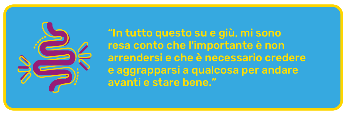 Così a lungo tempo sono stata bene, oserei dire molto bene. Fino a quando un evento ha sconvolto la mia vita, risvegliando anche la malattia. È successo quando ho perso la mia migliore amica, circa otto anni fa. Mentre facevo i conti con questo dolore nell'anima, anche quelli del fisico si sono fatti sentire. Così sono tornati tutti i sintomi, dolore compreso, e insieme a loro anche le paure che noi pazienti con malattia infiammatoria impariamo presto a conoscere: ci sarà un bagno in questo ristorante? Mi farà male se mangio questo? Posso fare una pausa caffè con i colleghi senza rischiare brutte figure? Riuscirò mai a fare quel viaggio tanto desiderato?