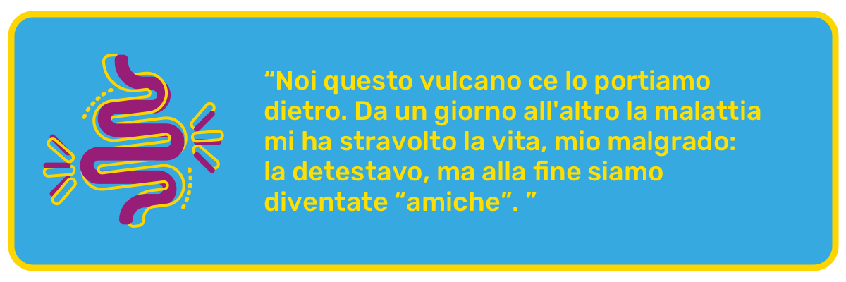 Noi questo vulcano ce lo portiamo dietro. Da un giorno all'altro la malattia mi ha stravolto la vita, mio malgrado: la detestavo, ma alla fine siamo diventate “amiche”. E per fortuna, considerando che dovrò conviverci per il resto della mia vita. Però cerco di tenerla al suo posto, so che c'è ma “fingo” di non avere nulla, perché non voglio farmi sconfiggere. Amiche sì, ma ciascuno al posto suo, cara rettocolite.