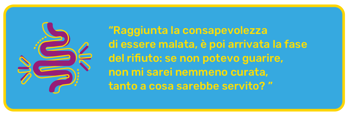 Ma anche questa strada non era percorribile. Non mi aveva aiutato ignorare la malattia, ignorare le terapie non sarebbe stato meglio. E se è vero che non facevo nulla per curarmi, ero comunque ossessionata dalla malattia e dal sangue: ogni volta che andavo in bagno esaminavo le mie feci con i guanti. Qualcosa è cambiato quando ho conosciuto il mio gastroenterologo: mi piace pensarlo come un angelo venuto dal cielo, perché è grazie a lui se ho imparato ad accettare la colite ulcerosa, a capire che non scomparirà, ma che posso conviverci.