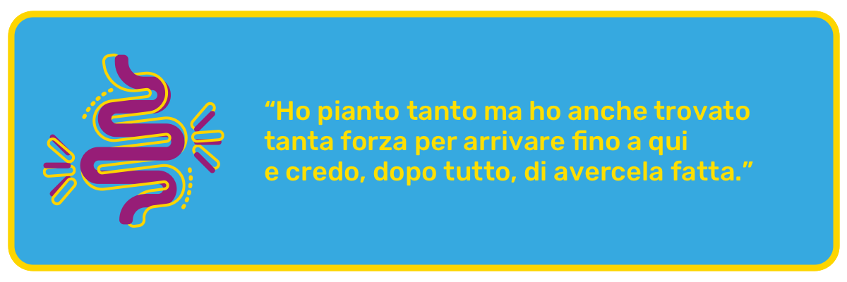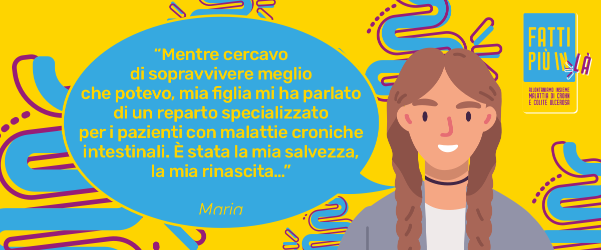 Mentre cercavo di sopravvivere meglio che potevo, mia figlia mi ha parlato di un reparto specializzato per i pazienti con malattie croniche intestinali. È stata la mia salvezza, la mia rinascita: grazie alla professionalità dei medici e alla loro competenza, alla loro umanità e grazie anche ai farmaci – ho iniziato una terapia biologica – finalmente ho cominciato a stare meglio. E anche la mia vita, oltre la malattia, ha preso il verso giusto: mi sono impegnata, sono riuscita a laureami alla soglia dei cinquant'anni e oggi insegno, dimostrando a me e a tutti che se vuoi puoi arrivare ovunque. È vero, c'è stato chi non ha capito, chi ha sottovalutato il mio dolore, anche per ignoranza, ma c'è stato anche chi mi ha aiutato.