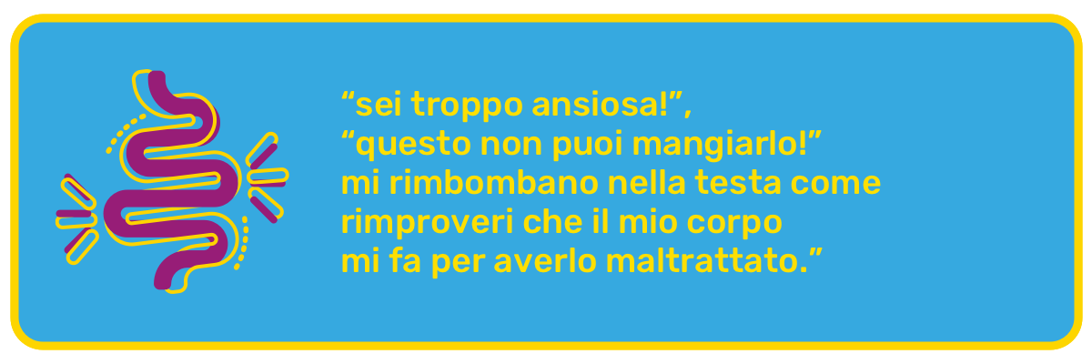 La sensazione però è la stessa da anni: inadeguatezza, ansia sociale e, come un cane che si morde la coda, fame nervosa. E ovviamente imbarazzo a volte: ricordo quando me la sono fatta letteralmente addosso o ho dovuto nascondere, in modo alquanto rocambolesco, rumori sinistri che provenivano dal bagno in cui, ahimè, c'ero io. Se non bastasse c'è poi spazio anche per una buona dose di sensi di colpa, anche se le cose non stanno così: “sei troppo ansiosa!”, “questo non puoi mangiarlo!” mi rimbombano nella testa come rimproveri che il mio corpo mi fa per averlo maltrattato.