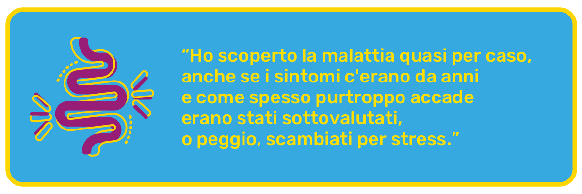 Uno “stress” fatto di forti dolori addominali e diarrea. Finché, dopo l'ennesimo accesso al pronto soccorso e l'ennesima consulenza chirurgica, qualcuno non ha intuito qualcosa. Il medico di turno quella volta mi consigliò un'ecografia alle anse intestinali, che prontamente feci da uno dei migliori ecografisti dell'epoca. E’ stato allora che il Crohn è entrato nella mia vita. Eppure quando il medico mi comunicò la diagnosi, io risposi scettica: “Ma no, ho già la spondiloartrite”, e lui mi spiegò che non era raro che le due malattie si presentassero insieme. Lo ignoravo. Feci ulteriori accertamenti e la diagnosi non cambiò, così come non cambiarono le terapie, che rimasero le stesse di quelle che seguivo per la spondiloartrite.