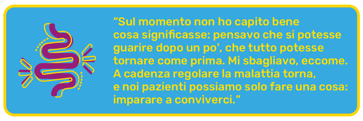 E infatti, se posso dare un consiglio a chi sta vivendo una condizione come la mia, è questo: cercate un supporto psicologico, vi aiuterà moltissimo. E poi non fermatevi al primo specialista che incontrate, ma siate esigenti, cercando qualcuno che faccia ricerca avanzata nel settore e che vi sappia ascoltare, facendovi le domande giuste sulla vostra vita prima della malattia, per individuare le radici del vostro male. Chi come noi combatte con una MICI non ha bisogno soltanto di medicine, ma anche di persone che prendano in carico la nostra difficoltà e sappiano gestirla con tutti gli strumenti che hanno a disposizione.